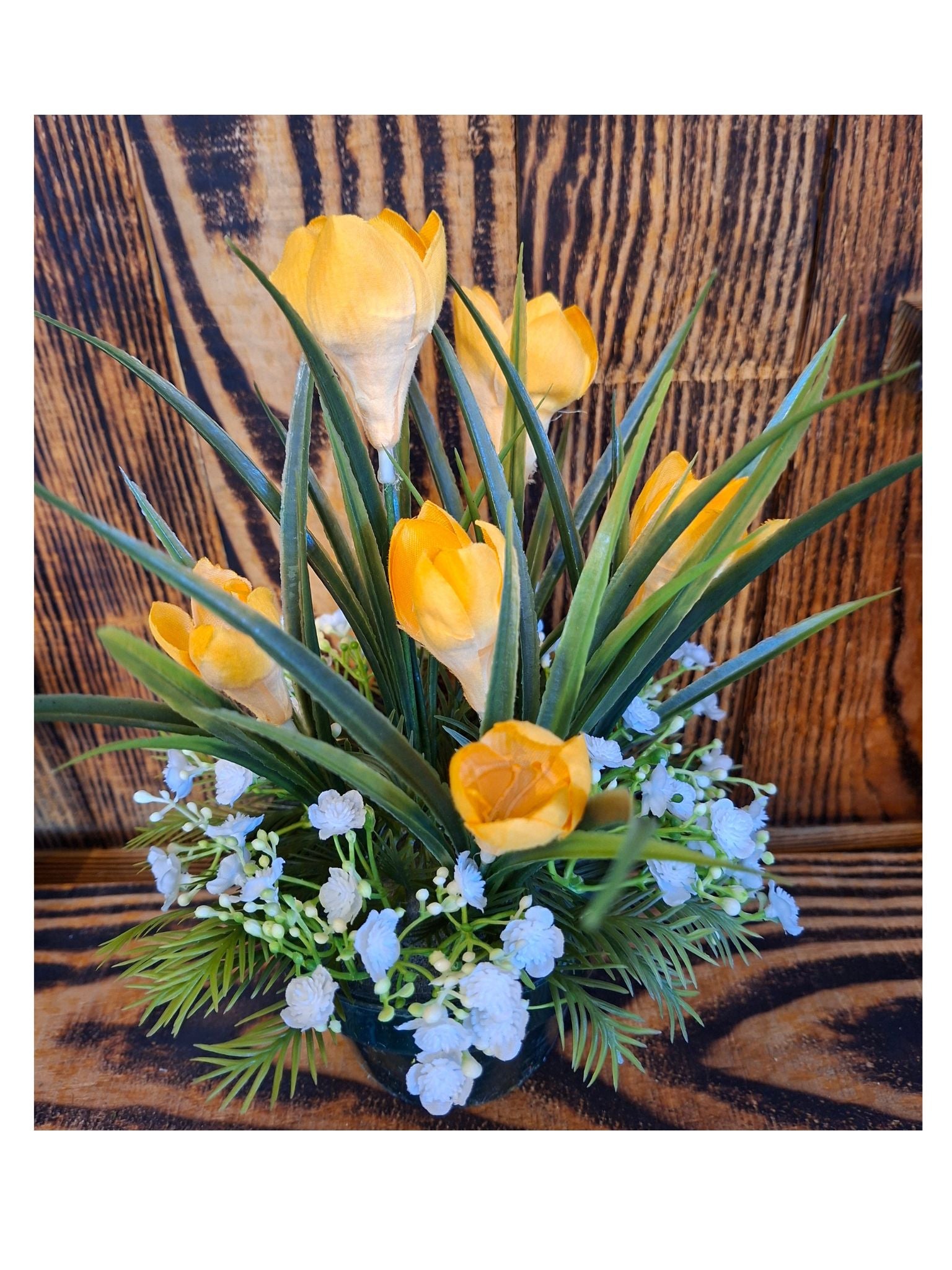 Composition florale mêlant crocus jaunes, gypsophile blanc et feuillage vert naturel, présentée dans un pot lesté.