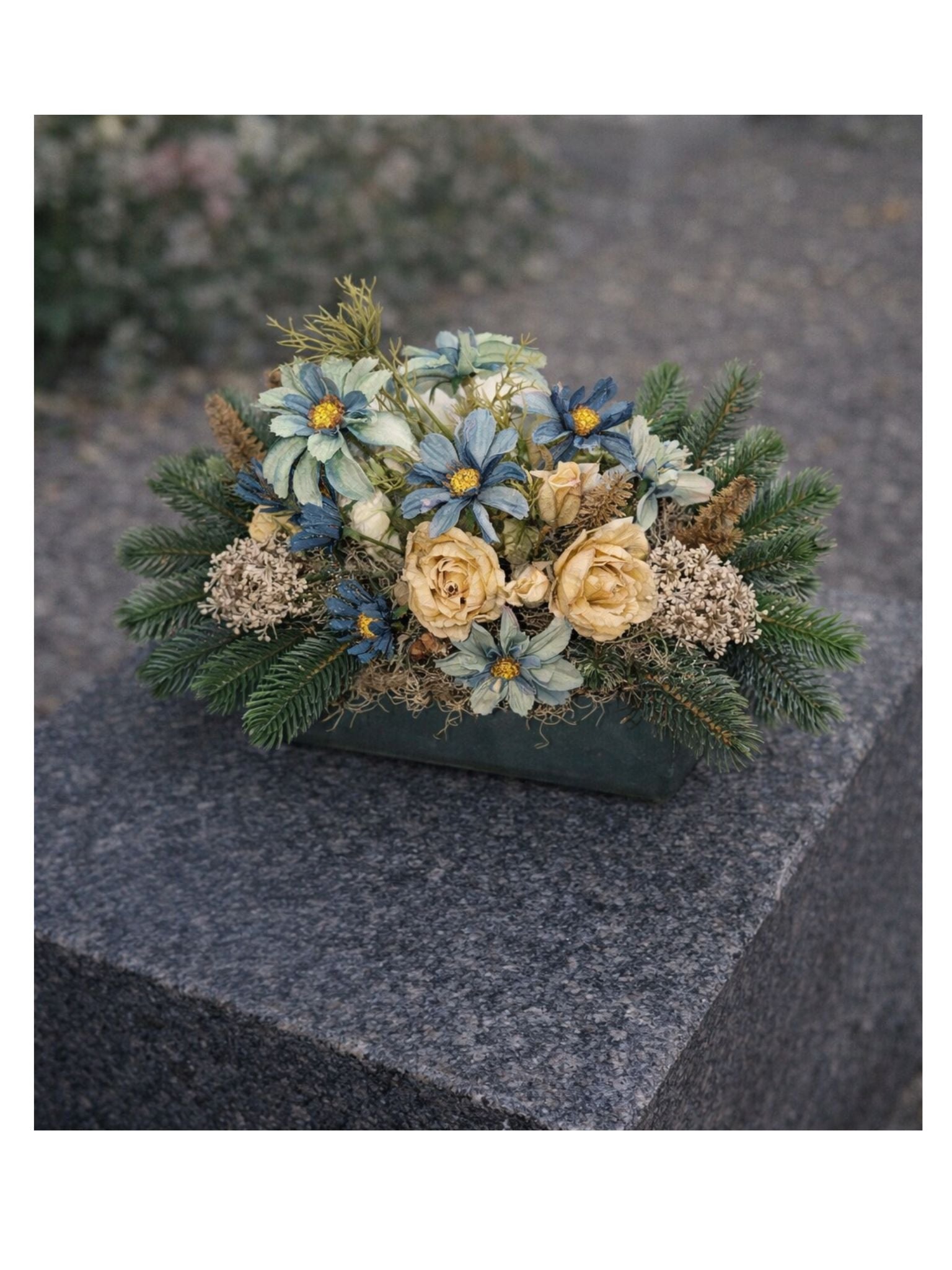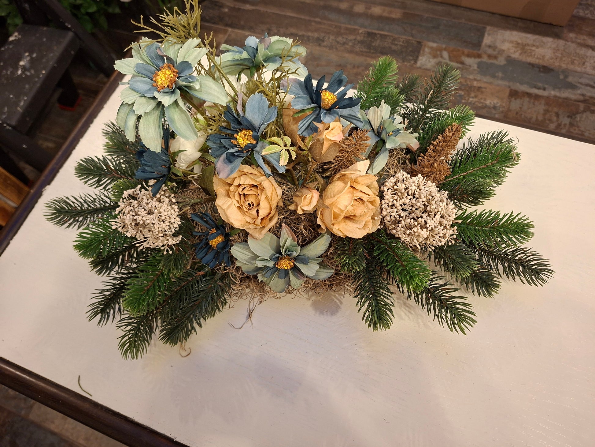 Montée dsu une bûche lestée, elle associe de délicates fleurs aux teintes bleu doux et ivoire, harmonieusement mêlées à un feuillage vert naturel évoquant la sérénité et la continuité.